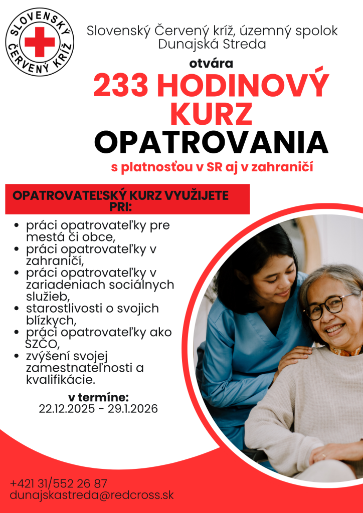 Nasledujúci termín 226 hod. kurz opatrovania detí a 233 hod. kurz opatrovania začína od 22.12.2025 do 29.01.2026 pre samoplatcov alebo možnosť preplatenia cez UPSVaR v Dunajskej Strede pre UoZ a ZoZ.