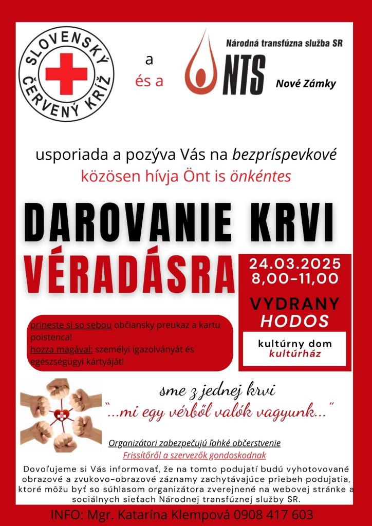 Slovenský Červený kríž a Národná transfúzna stanica usporiada a pozýva Vás na bezpríspevkové darovanie krvi dňa 24.03.2025 08:00-11:00 v kultúrnom dome vo Vydranoch