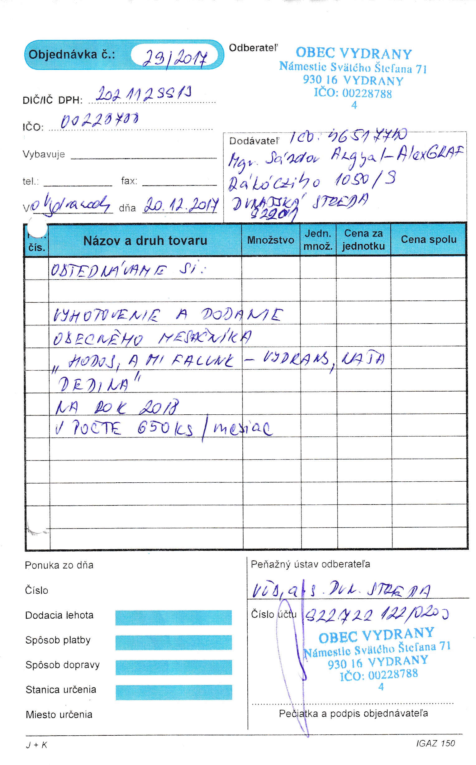 - Popis plneniavyhotovenie a dodanie obecného mesačníka - na rok 2018