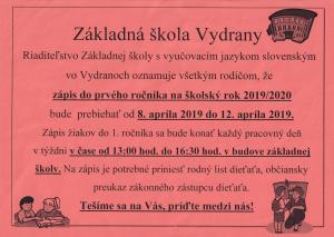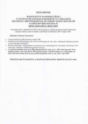 RIADITEĽSTVO MATERSKEJ ŠKOLY S VYUČOVACÍM JAZYKOM MAĎARSKÝM VO VYDRANOCH OZNAMUJE VÁŽENÝM RODIČOM, ŽE TERMÍN ZÁPISU DETÍ DO MŠ NA ŠKOLSKÝ ROK 2019/2020 JE OD 02. MÁJA DO 31. MÁJA 2019.
